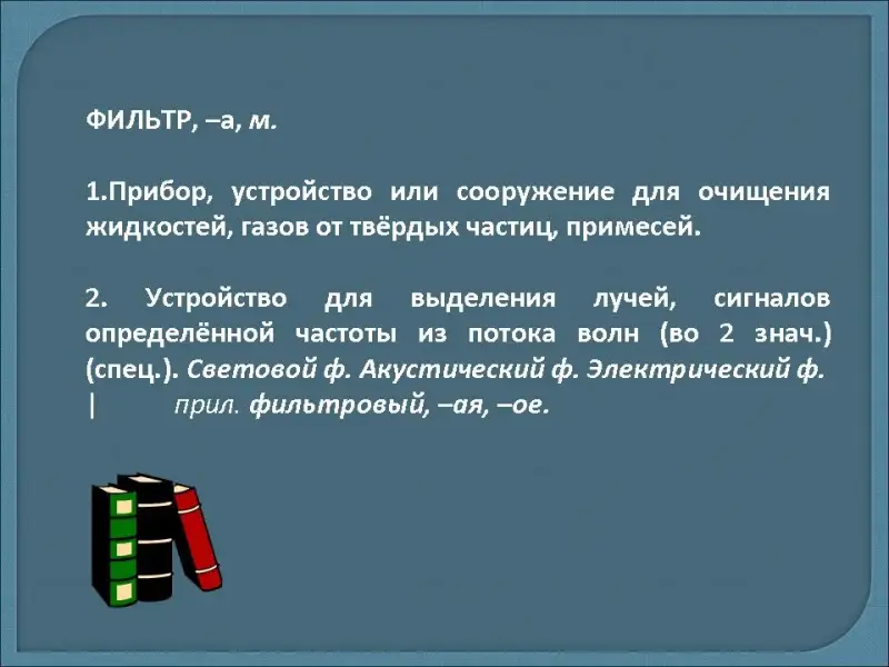 У. Что такое фильтр? (Прибор, устройство или сооружение для очищения жидкостей, газов от твёрдых частиц, примесей.) (Слайд 7)