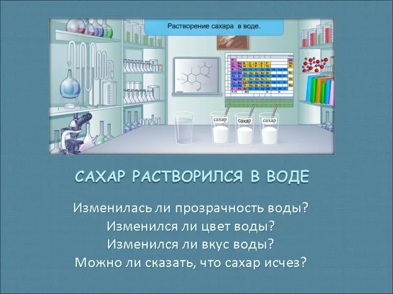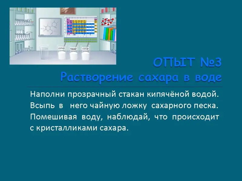 «Консультант» из каждой лаборатории берет второй набор и проводит опыт с сахаром. В прозрачный стакан наливает кипяченую воду. Всыпает в воду небольшое количество сахара. Группа наблюдает, что
