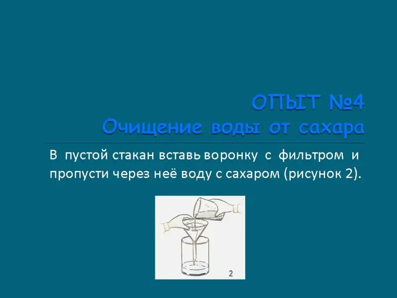 У. Пропустите воду с сахаром через бумажный фильтр. (Слайд 13)