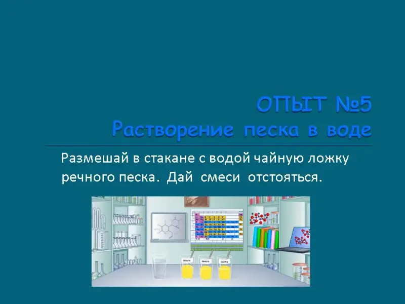 Проводят опыт с речным песком. Размешивают в стакане с водой чайную ложку речного песка. Дают смеси отстояться. Наблюдают, что происходит с песчинками и водой.