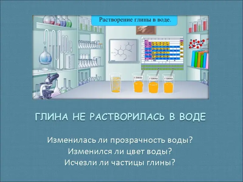 Проводят опыт с глиной. Размешивают в стакане с водой кусочек глины. Дают смеси отстояться. Наблюдают, что происходит с глиной и водой.