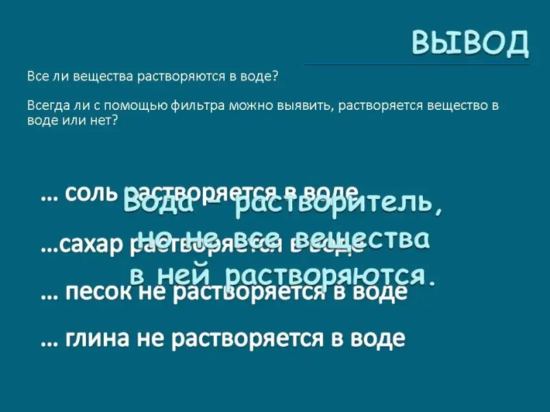 У. Сделайте вывод о свойстве воды как растворителя. (Вода - растворитель, но не все вещества в ней растворяются) (Слайд 25)