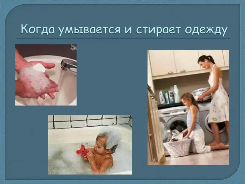 (Слайд 28) Когда мы моем руки, умываемся или купаемся, когда стираем одежду, то используем жидкую воду и ее свойство - растворителя.