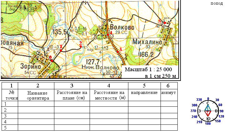 - Приготовить графический файл "поход" (см. Рисунок 3) с фрагментом топографической карты и компасом, точками маршрута, нанесёнными на карту и таблицей для заполнения.