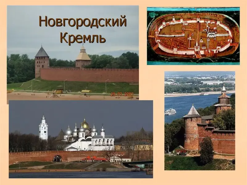 Кремль - центральная часть древнерусских городов, обнесённая крепостными стенами с башнями. На территории Новгородского кремля блестели на солнце золотые купола собора, названного, как и в Киеве,