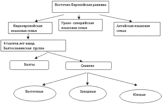 1. Учитель дает понятие языковой семьи. На доске начертить схему "Происхождение восточных славян"