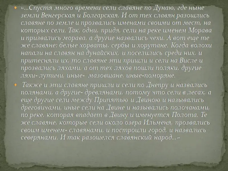 "…Спустя много времени сели славяне по Дунаю, где ныне земли Венгерская и Болгарская. И от тех славян разошлись славяне по земле и прозвались именами своими от мест, на которых сели. Так, одни, придя, сели на реке именем Морава и призвались морава, а другие назвались чехи. А вот еще те же славяне: белые хорваты, сербы и хорутане. Когда волохи напали на славян на дунайских, и поселились среди них, и притесняли их, то славяне эти пришли и сели на Висле и прозвались ляхами, а от тех ляхов пошли поляки, другие ляхи- лутичи, иные- мазовшане, иные-поморяне.