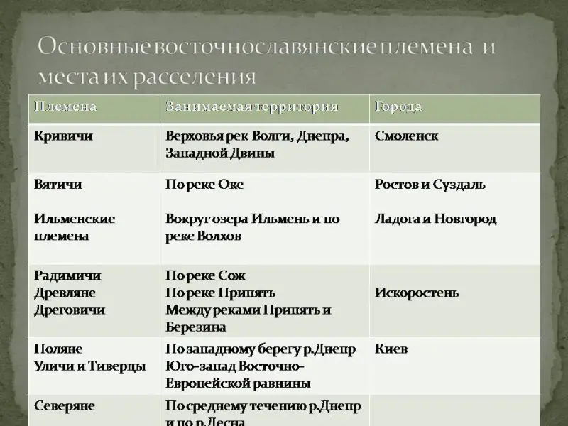 | Восточнославянские племена | Места их расселения |