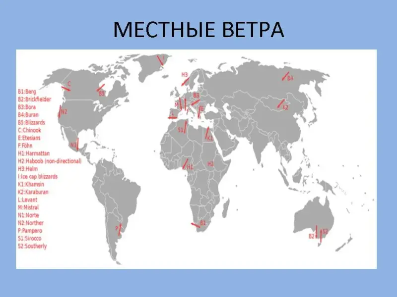 2в) Мы с Вами сейчас познакомились с двумя видами ветра: бризом и муссоном. Но ветер носит разные имена. Это зависит от рельефа и народности, которая занимает данную территорию.