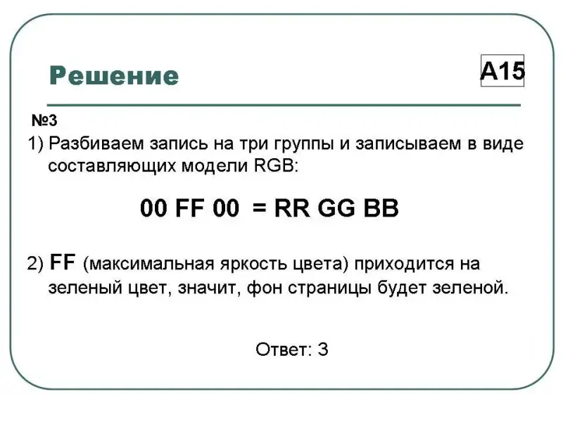 2) FF (максимальная яркость цвета) приходится на зеленый цвет, значит, фон страницы будет зеленой.