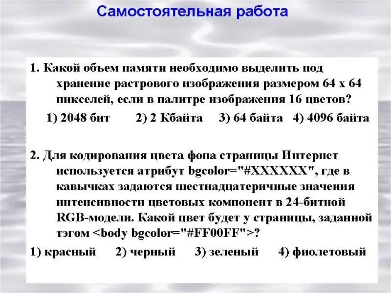 1. Какой объем памяти необходимо выделить под хранение растрового изображения размером 64 х 64 пикселя, если в палитре изображения 16 цветов?