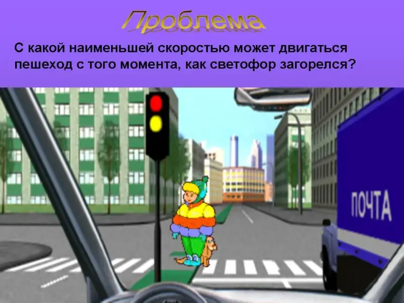 - А знаете ли вы, с какой наименьшей скоростью может двигаться пешеход с того момента, как светофор загорелся? Слайд 4