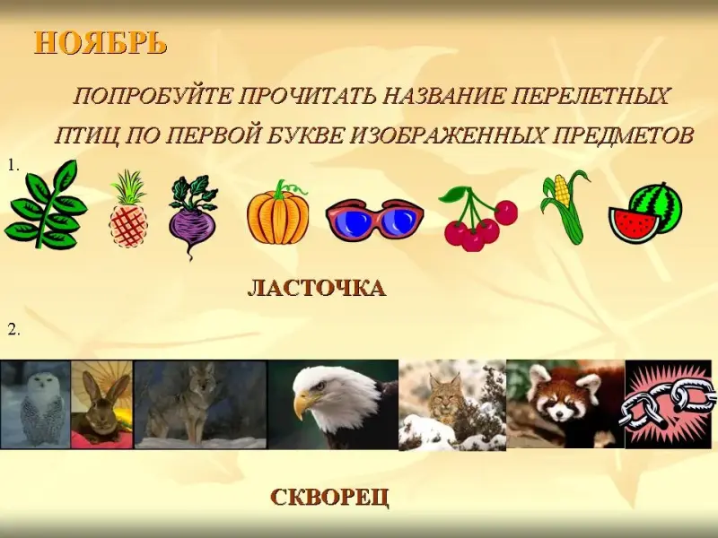 Попробуйте прочитать название перелетных птиц по первой букве изображенных предметов(Ласточка, скворец)