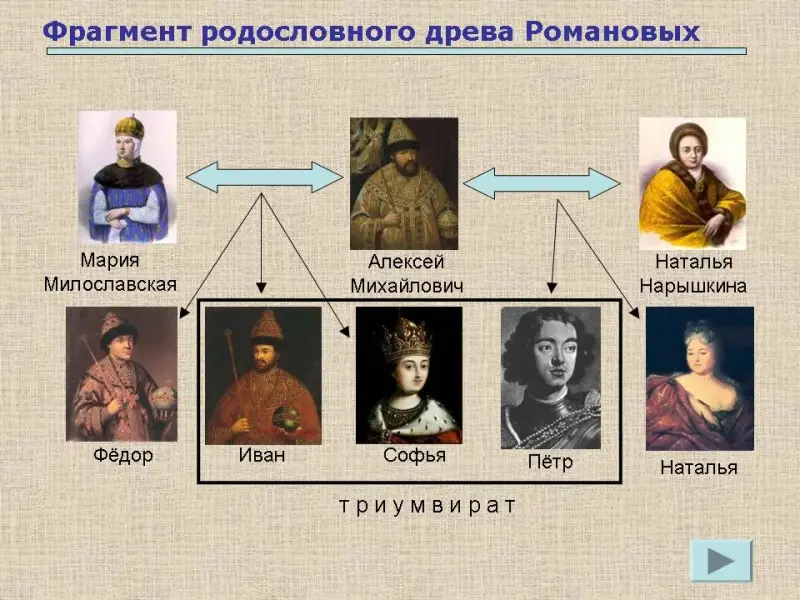 1682 год - смерть царя Фёдора III. Не оставил наследника. Вопрос о престолонаследнике: Иван или Пётр. Борьба двух группировок Милославских и Нарышкиных. Установление «триумвирата». На доске термин: «триумвират». Слайд № 3.