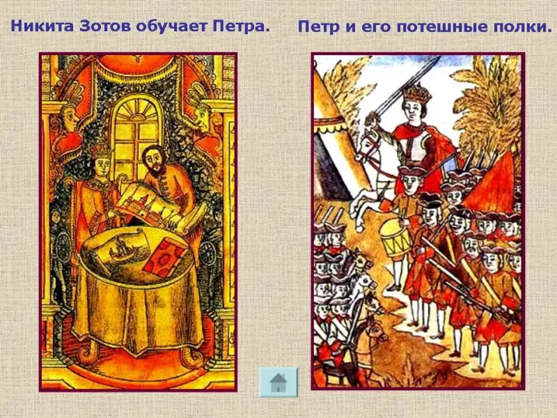 Царь Пётр в управлении страной участия не принимал, ему было всего 10 лет. В годы регенства Софьи он большую часть времени проводил вне Москвы в селе Преображенское. Он получил начальное образование на уроках дьяка Никиты Зотова. Слайд № 6.