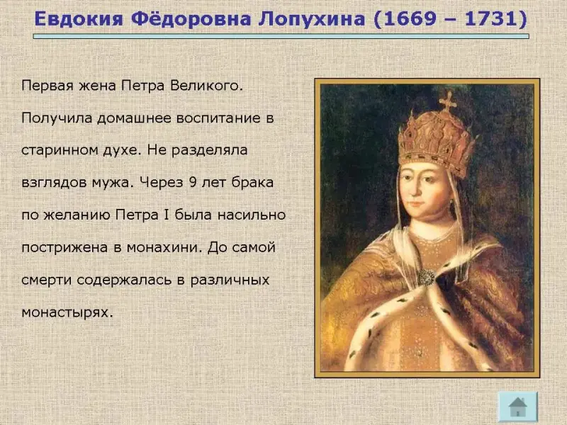 В 1689 г. Положение Петра изменилось - он вступил в брак с Евдокией Лопухиной. Это означало наступление совершеннолетия. Слайд № 7.