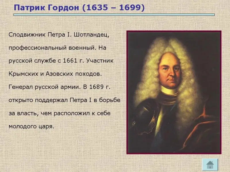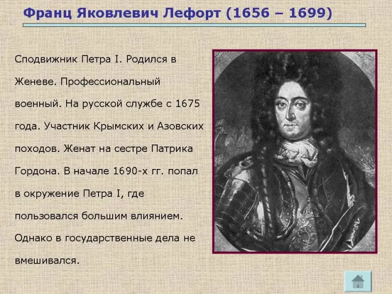 Но именно там Пётр познакомился с двумя людьми, ставшими его близкими соратниками, советниками, друзьями. Это Патрик Гордон и Франц Лефорт. Слайды № 9, 10.