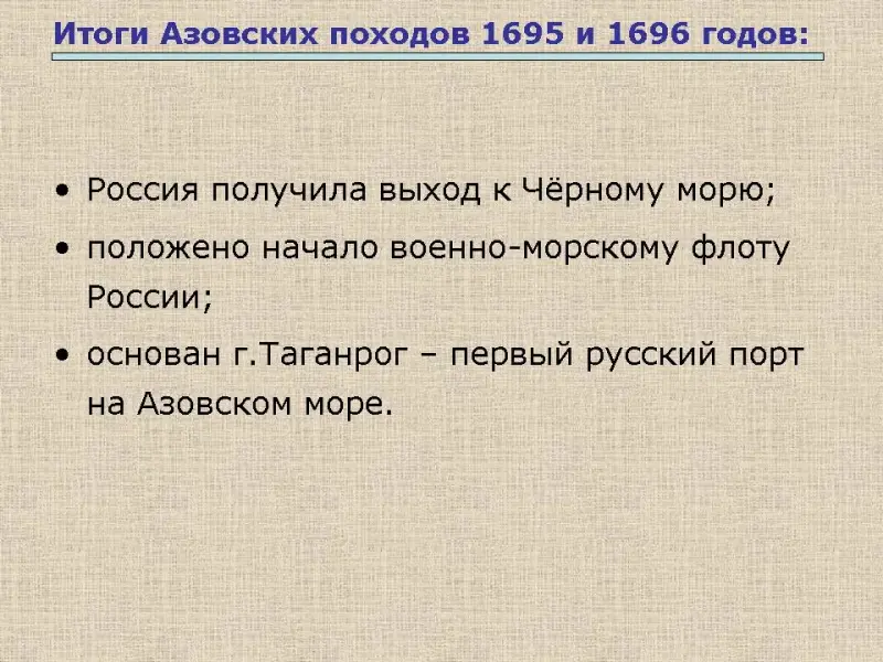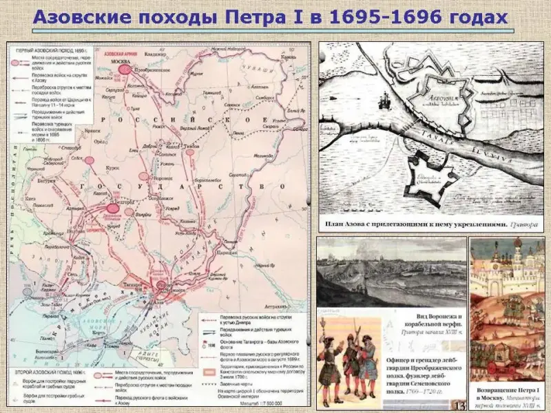 В 1695 г. тремя самостоятельными отрядами, подошли к Азову в разное время, нет флота - подвоз турецких подкреплений, неумелое использование артиллерии, ее малочисленность; низкая боеспособность стрелецких полков - несколько неудачных штурмов. Первый поход закончился неудачей. Подготовка второго похода: строительство флота на верфях в г.Воронеж. В качестве образца из Голландии была доставлена 32-х весельная галера.