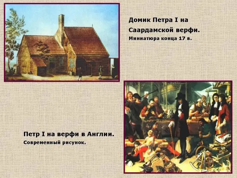 Пётр за границей. Работа и посещение верфей Голландии и Англии. В Вене Петр узнает о заговоре противников преобразований и спешит в Москву, где жестоко расправляется с заговорщиками. Слайды № 14,15.