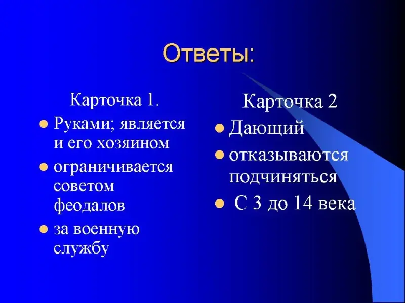 - Прежде чем приступить к изучению новой темы, следует повторить основные термины и понятия предыдущего раздела истории, которые имеют непосредственное отношение к теме сегодняшней. Работа производится по карточкам. На них вопросы и ответы на них. Задача - найти ошибки в формулировке данных определений. На работу вам отводится 5 мин. (Приложение 1). Карточки необходимо подписать.