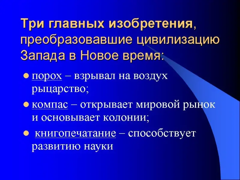 Прежде, чем вы приступите к изучению научных достижений самостоятельно, запишем Три главных изобретения, преобразовавшие цивилизацию Запада в Новое время: порох - взрывал на воздух рыцарство; компас - открывает мировой рынок и основывает колонии; книгопечатание - способствует развитию науки. А