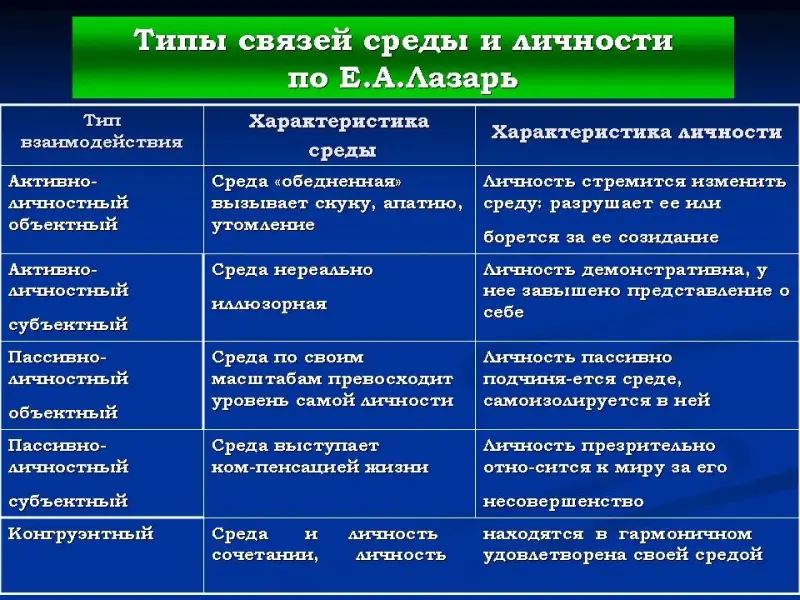 | Тип взаимодействия | Характеристика среды | Характеристика личности |