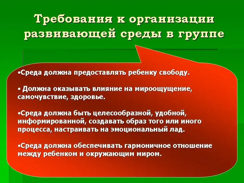 Осознавая значимость среды в становлении и оздоровлении личности, я определила требования к ее организации. На мой взгляд, она должна предоставлять ребенку свободу, оказывать влияние на мироощущение, самочувствие, здоровье. Среда должна быть целесообразной, удобной, информированной, создавать образ того или иного процесса, настраивать на эмоциональный лад, обеспечивать гармоничное отношение между ребенком и окружающим миром.