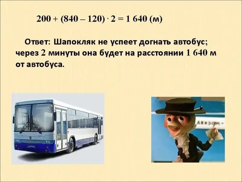 - Как вы думаете сможет ли Шапокляк догнать автобус? Почему? (Расстояние между объектами увеличивается, поэтому встреча не произойдет.)