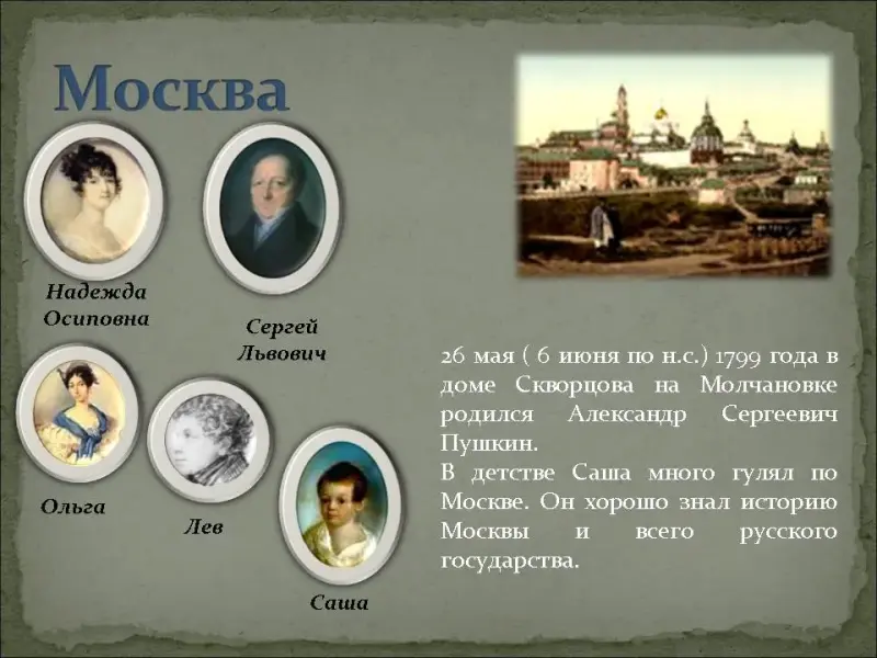 - 26 мая ( 6 июня по н.с.) 1799 года в доме Скворцова на Молчановке родился Александр Сергеевич Пушкин. Его мамой была Надежда Осиповна, в девичестве Ганнибал, а отцом - Сергей