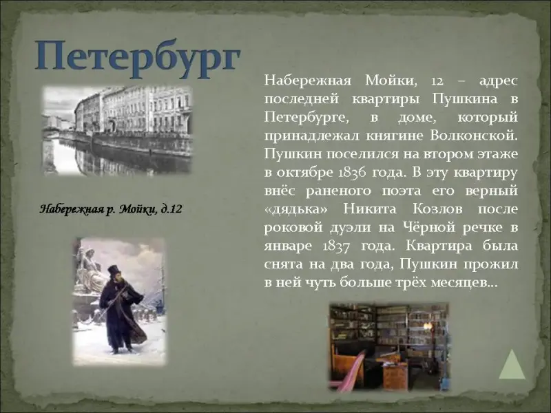 - Набережная Мойки, 12 - адрес последней квартиры Пушкина в Петербурге, в доме, который принадлежал княгине Волконской. Пушкин поселился на втором этаже в октябре 1836 года. В эту