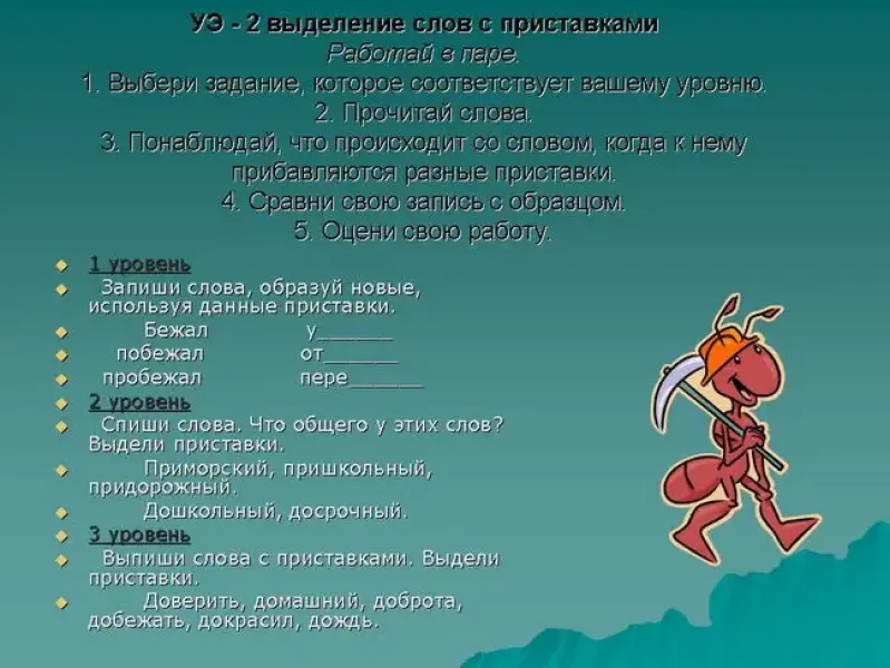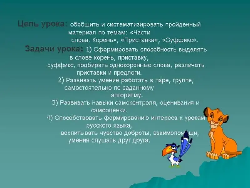 - Сформировать способность выделять в слове корень, приставку, суффикс, подбирать однокоренные слова, различать приставки и предлоги.