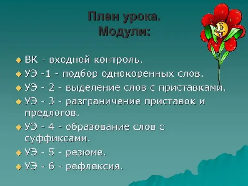 Цель урока: обобщить и систематизировать пройденный материал по темам: "Части слова. Корень", "Приставка", "Суффикс".