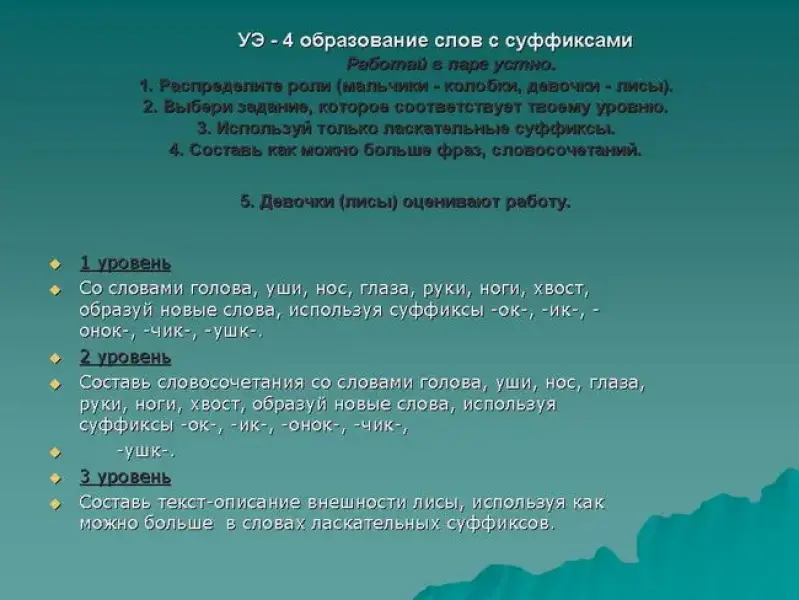 Составь словосочетания со словами голова, уши, нос, глаза, руки, ноги, хвост, образуй новые слова, используя суффиксы -ок-, -ик-, -онок-, -чик-, -ушк-.