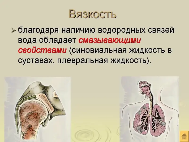 Вода обладает рядом свойств, благодаря способности своих молекул связываться друг другом при помощи водородных связей. Молекула воды полярна - диполь. Положительные заряды сосредоточены у атомов водорода, так как кислород электроотрицательнее водорода. Отрицательно зараженный атом кислорода одной молекулы вода притягивается к положительно заряженному атому водорода другой молекулы с образованием водородной связи. Водородная связь слабее ковалентной связи, поэтому она легко разрывается.(слад 8). Таким образом, в жидкой воде молекулы подвижны, они легко проникают через клеточные мембраны. Это очень важно для процессов обмена веществ.(Рисунок 1. на стр. 9.)