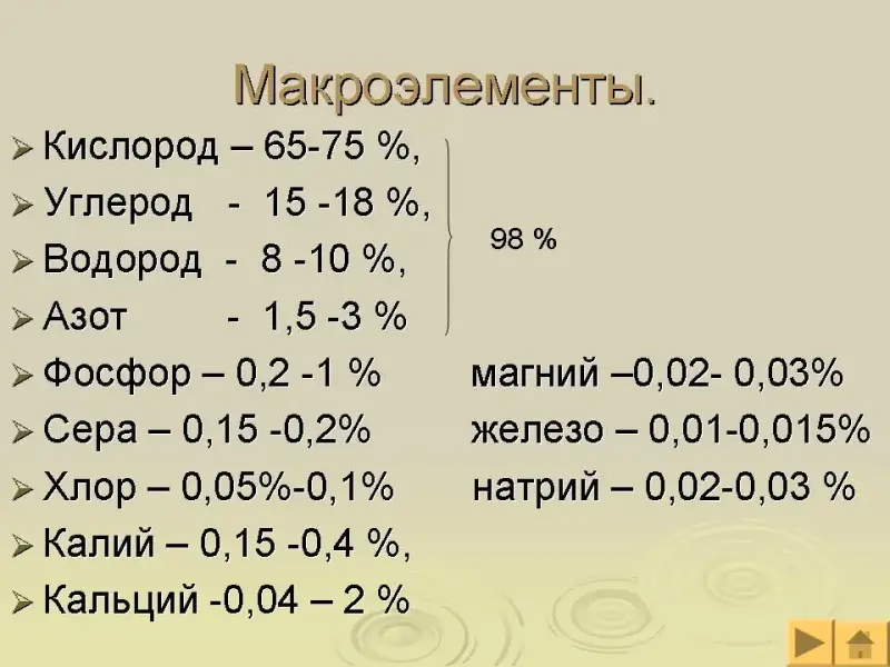 1. Макроэлементы - химические элементы в сумме составляющие около 98 % всего содержимого клетки ( H , N,O, C ). (слайд 22)