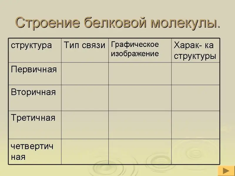 - Заполните таблицу " Строение белковой молекулы" (слайд 60)