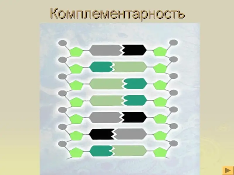 1. Комплементарность - избирательное соединение нуклеотидов, с образованием пары А = Т; Г = Ц. Если известна последовательность оснований в одной цепи, то, благодаря комплементарности, можно узнать последовательность оснований другой цепи.