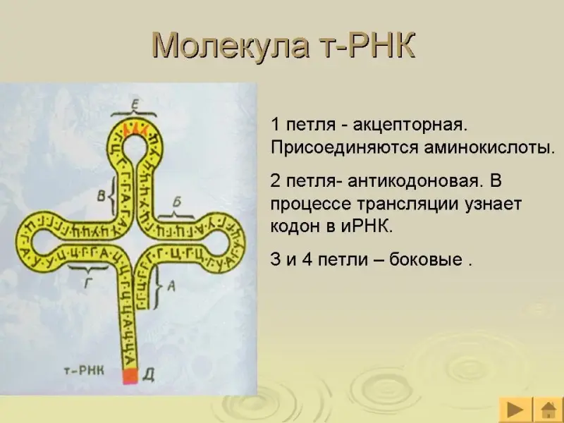У тРНК есть четыре петли: акцепторная, для присоединения аминокислоты; антикодоновая, для узнавания кодона во время трансляции и две боковые петли.