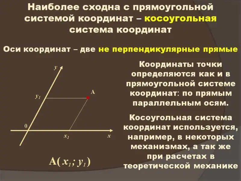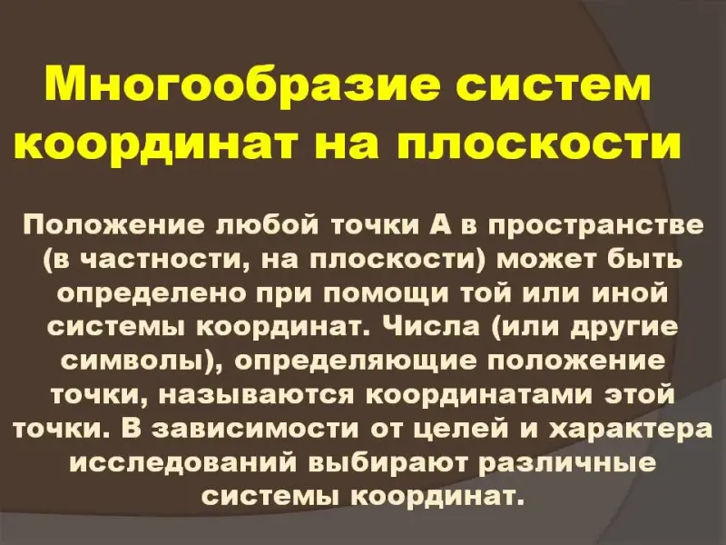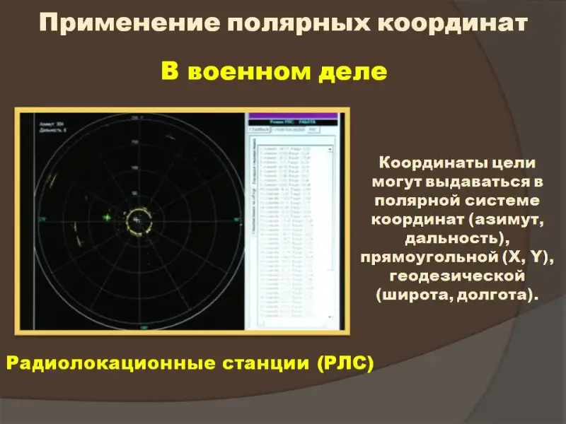 От декартовой системы координат мы перешли к косоугольной системе координат (Слайд №6) и географическим координатам. После такого обзора ввели основные понятия полярной системы координат: полюс, полярный луч, и координаты: радиус и угол поворота (Слайд №8). На слайдах № 6, 8, 10 используется автоматическая анимация.
