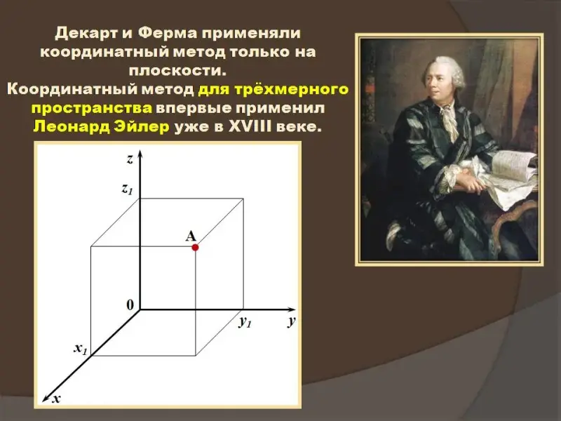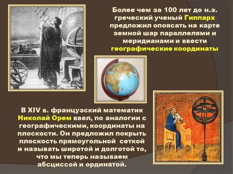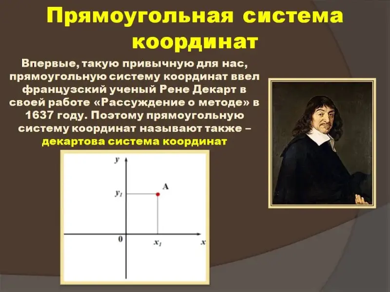 Первые пять слайдов презентации посвящены понятию координат точки и декартовой системе координат. Мы снабдили их полезной, на наш взгляд, но краткой исторической справкой.