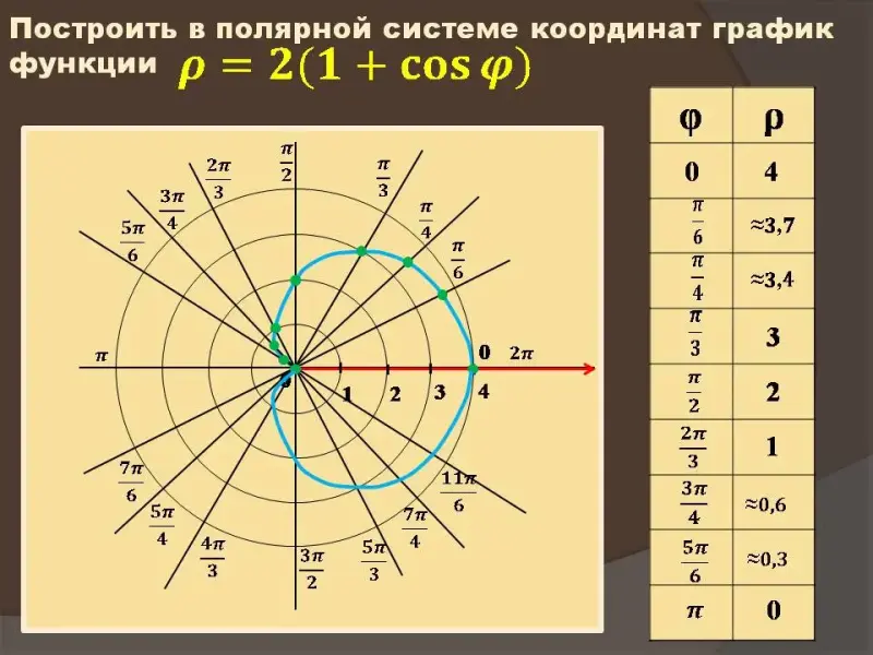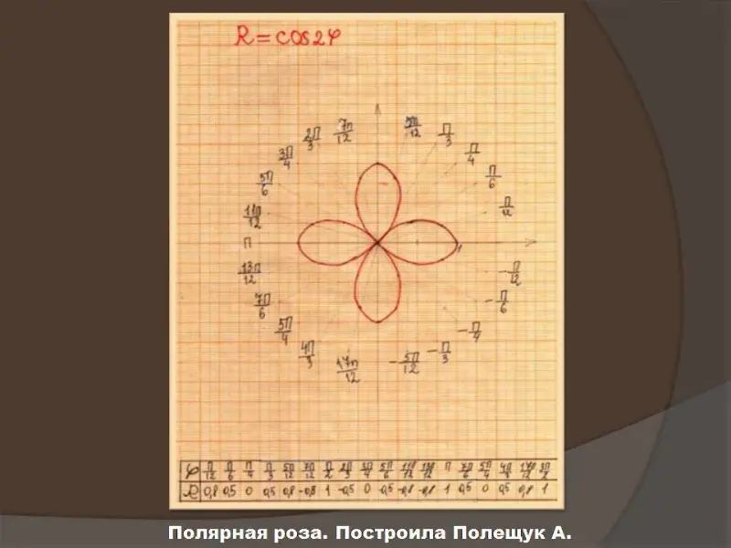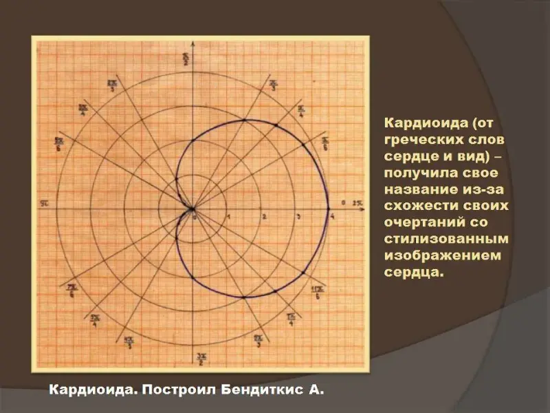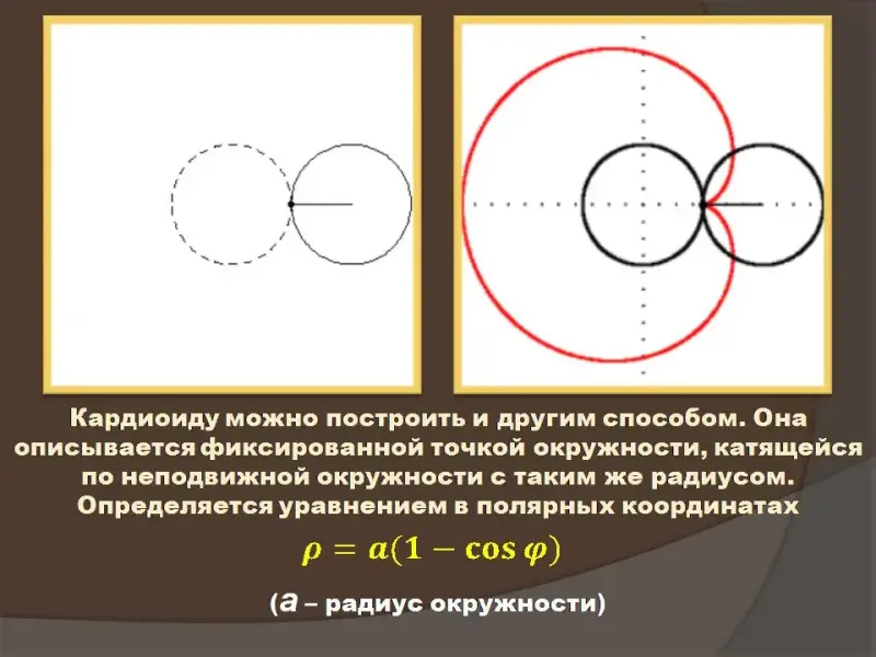 Следующим этапом урока является связь полярной системы координат и декартовой (Слайды №10, №12). После каждой группы формул перехода от одной к другой системе координат учащимся предлагаются задания с дальнейшей проверкой их на экране (Слайды №11, №13). Основная часть времени урока отводится на одновременное построение кардиоиды у учащихся в тетради и на экране (Слайд №14). Мы умышленно включили в презентацию слайд, демонстрирующий всем учащимся график кардиоиды, построенный на миллиметровой бумаге одним из их одноклассников, занимавшимся полярной системой координат в рамках проекта (Слайд №15). После построения графика кардиоиды аналитическим методом демонстрируется другой способ построения, основанный на движении фиксированной точки одной окружности, катящейся по другой неподвижной окружности того же радиуса (Слайд №16).