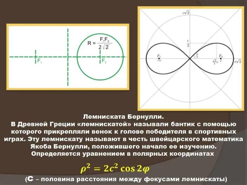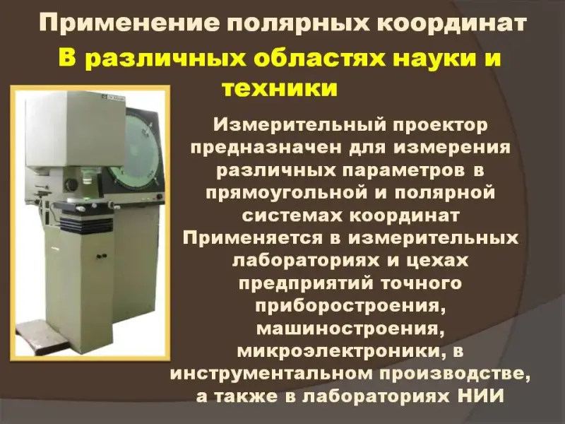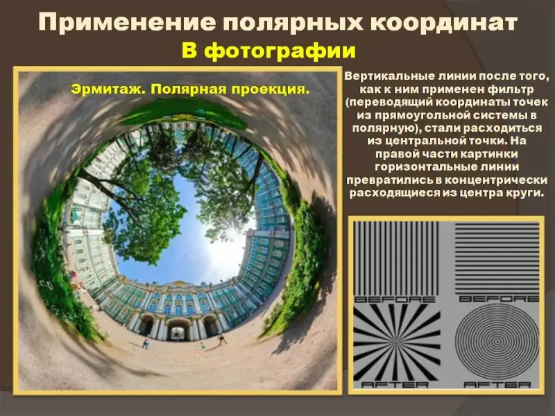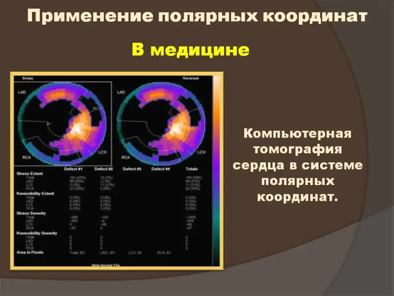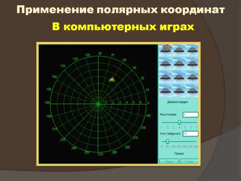Затем вниманию учащихся предлагаются некоторые замечательные кривые в полярных координатах (лемниската Бернулли, полярная роза, спираль Архимеда) (Слайды №16 - №20). В заключительной части урока рассмотрены применения полярной системы координат в фотографии, в военном деле, в медицине, в системах идентификации, в геодезии, в компьютерных играх. В конце урока всем заинтересовавшимся предлагаются возможные темы для дальнейшего исследования.