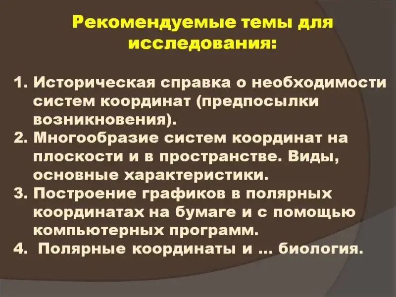 Мы решили попробовать исправить ситуацию, предложив сильной группе учащихся заняться исследовательской деятельностью и познакомиться с полярной системой координат. По мере работы над проектом у учащихся возникло желание ознакомить с результатами своей работы остальных учеников класса. Мы охотно пошли навстречу, подготовили и провели обучающий урок-презентацию, который в доступной форме даёт представление о полярных координатах. Ученики, занимавшиеся данной темой в рамках проектно-исследовательской работы, были на определённых этапах этого урока помощниками своим одноклассникам.