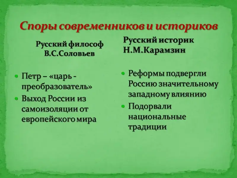 Русский историк Карамзин Н.М. считал, что реформы Петра I не так уж велики, они подвергли Россию значительному западному влиянию, подорвали национальные традиции.