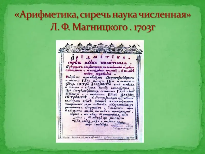 Кроме того были заменены буквенные обозначения чисел арабскими цифрами. Первые русские книги с арабскими цифрами появились в 1703 году Слайды 10, 11.