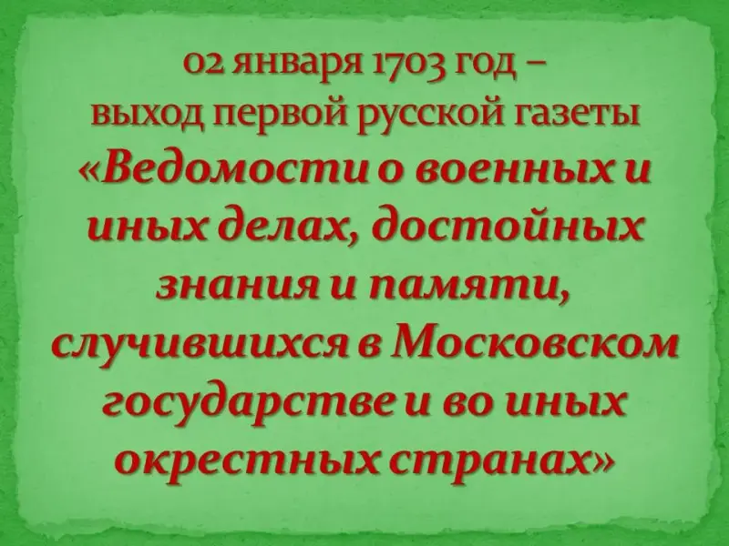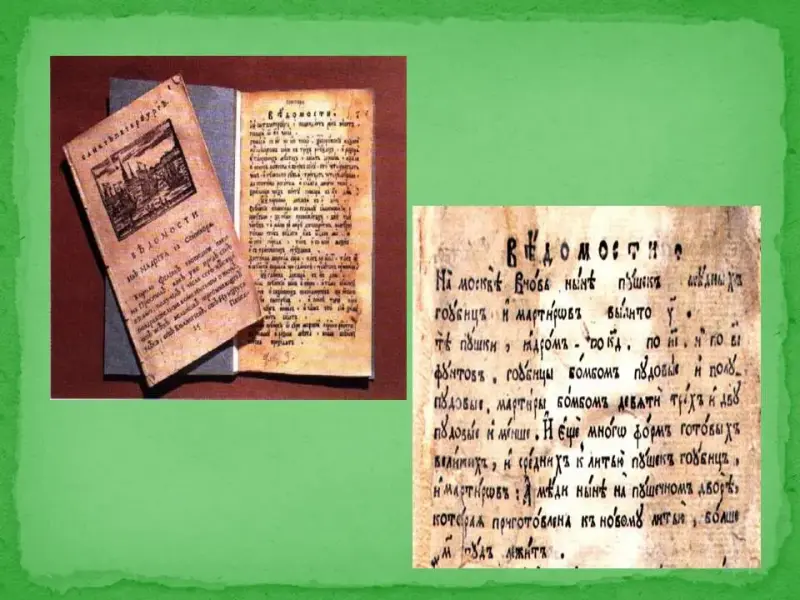 Выступление проектной группы 6: Слайд 12, 13. начиная с правления Петра I, власть начинает формировать систему печатной информации. 02 января 1703 года вышла первая русская газета «Ведомости о военных и иных делах, достойных знания и памяти, случившихся в Московском государстве и во иных окрестных странах».