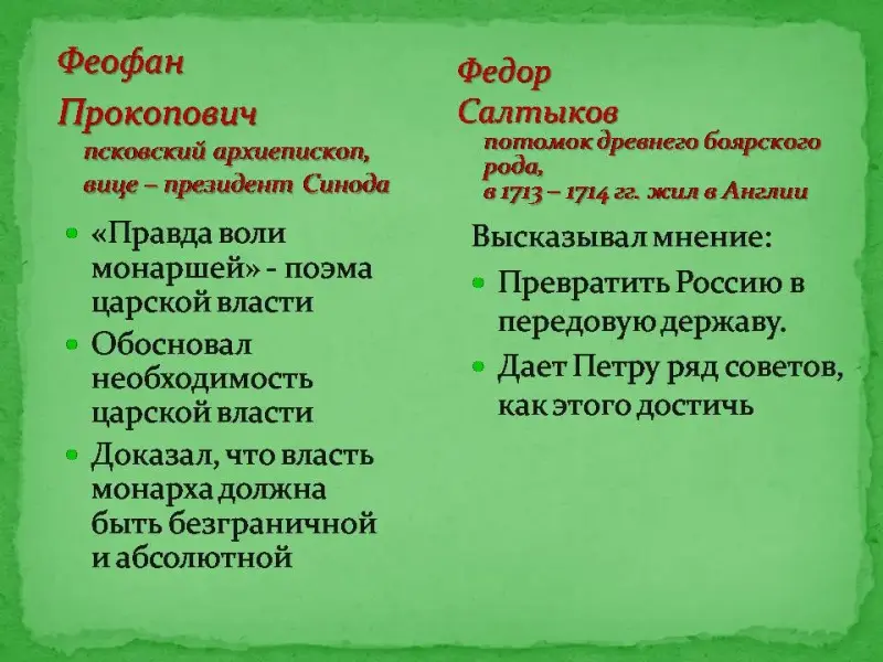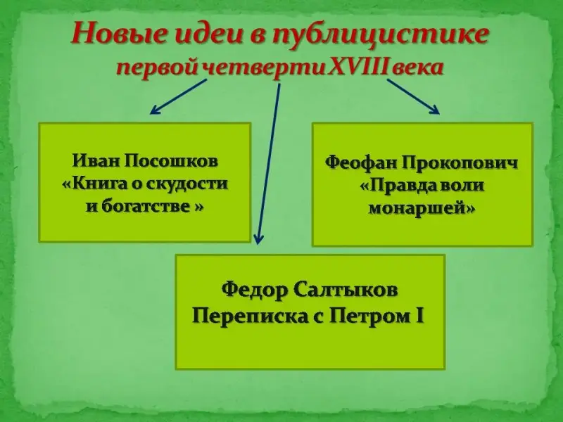 - используя дополнительную литературу, выявить и осветить взгляды публицистов XVIII века: Феофана Прокоповича, Федора Салтыкова, Ивана Посошкова, подготовить защиту своего проекта (проектная группа 7).