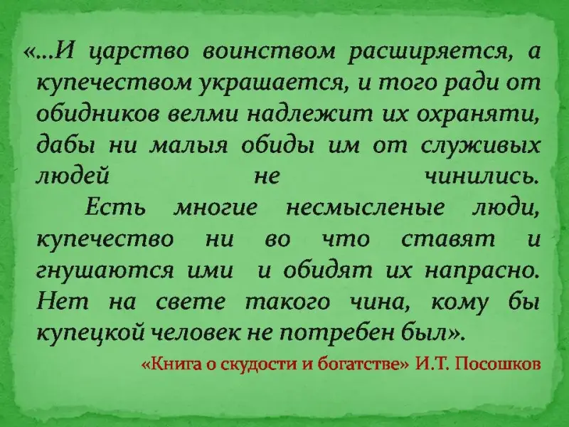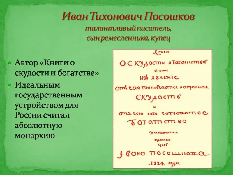 Слайд 17. Талантливый публицист и писатель начала XVIII века Иван Тихонович Посошков считал идеальным государственным устройством для России абсолютную монархию, его перу принадлежит труд «Книга о скудости и богатстве». (Ученики из проектной группы 7 предлагают проанализировать отрывок из произведения Посошкова И.Т.). Слайд 18.