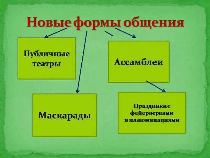 Учитель истории: рассмотренные идеи и нововведения в совокупности своей вели к кардинальному изменению общественных отношений. В связи с этим в российском обществе начала XVIII века появляются новые формы общения: театр, Ассамблея, маскарад, праздники с фейерверками. Слайд 19.