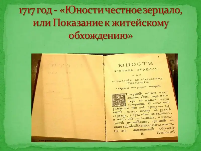 Учитель русского языка: … а потому очень кстати будет совет-наставление из книги для отроков, выпущенной по распоряжению Петра «Юности честное зерцало»: «…говорить с людьми должно благочинно, учтиво, разумно, а не много говорить, потом слушать, и других речи не перебивать, но дать возможность все выговорить, и потом мнение свое, что достойно, предъявить»